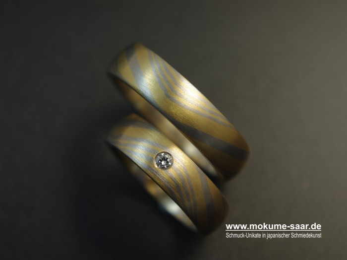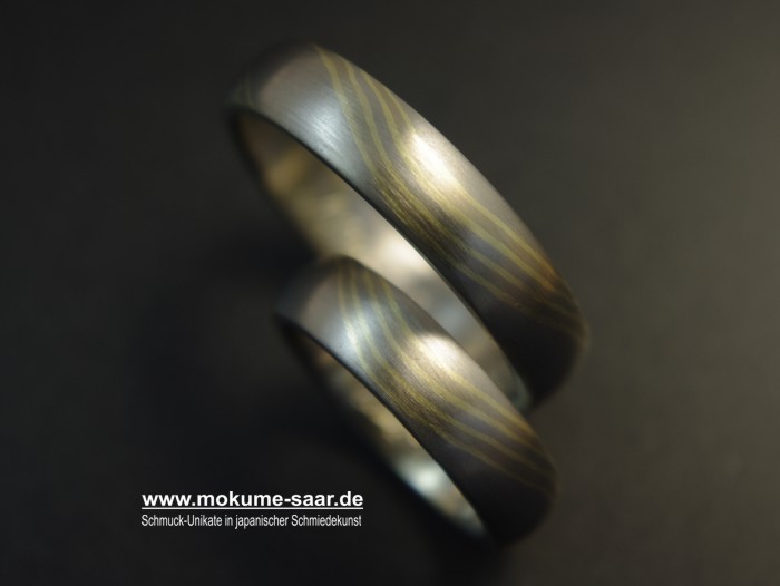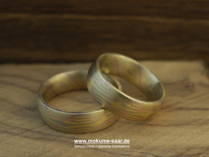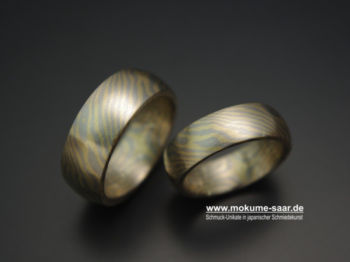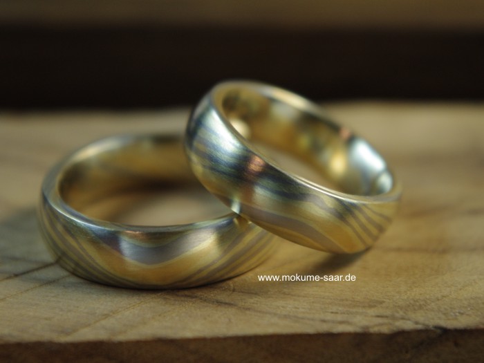Mokume Gane geht auch dezent!05/06/14 Mokume Gane geht auch dezent! Wenn wir bei der Anordnung der Schichten für unsere Trauringe kein Silber verwenden, wird der Kontrast der Edelmetallfarben beim Muster der Schmuckstücke eher dezent. Das kommt besonders denjenigen entgegen, die nicht so gern einen auffälligen Ring tragen möchten und trotzdem nicht auf die besonderen Muster der Mokume Gane Schmiedekunst verzichten möchten. Allerdings haben die Ringe dann immer ein sehr viel höheres Gewicht. So hören wir oft "Uff, ist der Ring aber schwer..." Aber wir können Ihnen versichern: daran gewöhnt man sich sehr schnell! Ein paar Beispiele für Mokume Gane Eheringe ohne Silber haben wir zum Beispiel hier: Mixen lassen sich zum Beispiel Rotgold, Orangegold, helles und dunkles Weißgold, Grüngold und auch Platin - wobei wir bei der Verarbeitung auf die geeigneten Schmelzpunke zum Verschweißen achten müssen.
