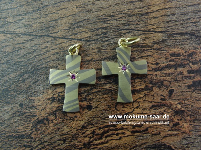 Aus einem Mokume Gane Reststück der Trauringe haben wir zur Taufe des Nachwuchses ein Taufkreuz angefertigt. Und weil das der Mama so gut gefiel, wurde für sie auch so ein Anhänger geschmiedet. Ein schönes Beispiel für die Einzigartigkeit von Mokume Gane Schmuckstücken: obwohl beide Kreuze die gleiche Form und Größe haben und auch aus dem gleichen Material hergestellt wurden, sehen sie doch ganz und gar nicht gleich aus. Ein Unikat ist eben ein Unikat!
