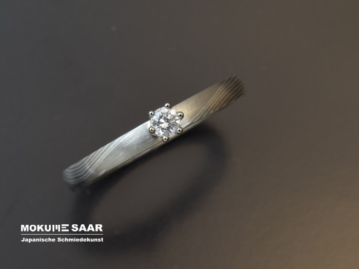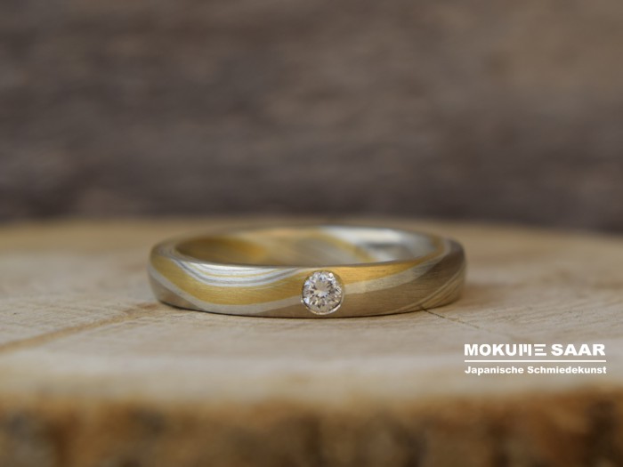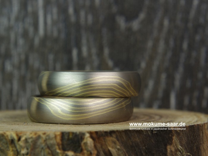 Bei Mokume Gane gibt es charakteristische Muster-Designs, die wir bei der Herstellung unserer Mokume Gane Schmuckstücke entstehen lassen. Eines dieser grundlegenden Muster möchte ich Euch jetzt vorstellen: Das WellenmusterDas Wellenmuster ist eines der beliebtesten Muster für unsere Trauringe. Kunden wählen es gern, weil es sanft, unaufdringlich und insgesamt sehr harmonisch ist. Bei diesem Design können sie sicher sein, dass sie sich an dem Muster auch in Zukunft nicht satt sehen werden und ihnen ihre Schmuckstücke in zehn Jahren immer noch gefallen werden. Trauringe mit dieser Musterung können wir in sehr vielen Varianten gestalten. Wellen aus vielen dünnen Linien oder lieber mit breiten Farbflächen, ein breites Ringprofil oder schmale Ringe, mit viel Gold oder bevorzugt nur in Grautönen - Gestaltungsmöglichkeiten haben wir viele, und jedes Mal erhalten die Ringe ein neues Erscheinungsbild. Wie ein Wellenmuster aussehen wird hängt davon ab, auf welche Weise wir die Ringe herstellen: Welche Edelmetalle und Farben werden zusammen gebracht, welche Breiten und Profile erhalten die Ringe? Wählen wir (oder besser gesagt unsere Kunden) eine andere Farbzusammenstellung, dann wird das Aussehen der Trauringe wieder ein anderes sein. Für besonders schmale Ringe ist das Wellenmuster ebenfalls sehr gut geeignet, denn die Linien sind auch auf einer kleinen Oberfläche gut zu sehen. Besonders für die Gestaltung von Mokume Gane Verlobungsringen ist das interessant, denn hier ist in der Regel eine zierliche Ringschiene gefragt. Am schönsten entfalten sich Farben in Kombinationen, in denen Silber enthalten ist, denn die helle Farbe des Silbers bringt sie regelrecht zum Leuchten. Ist Silber mit im Spiel, können wir die Oberflächen zusätzlich ätzen und heben dadurch die Kontraste noch deutlicher hervor. Ohne Silber wird es besonders fein und edel und auch hier gibt es wunderschöne Farbkontraste. ![]() Wenn Ihr Euch die Vielfalt des Wellenmusters bei der Trauring-Gestaltung ansehen möchtet, schaut einfach in unserer Bildergalerie vorbei: