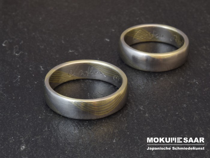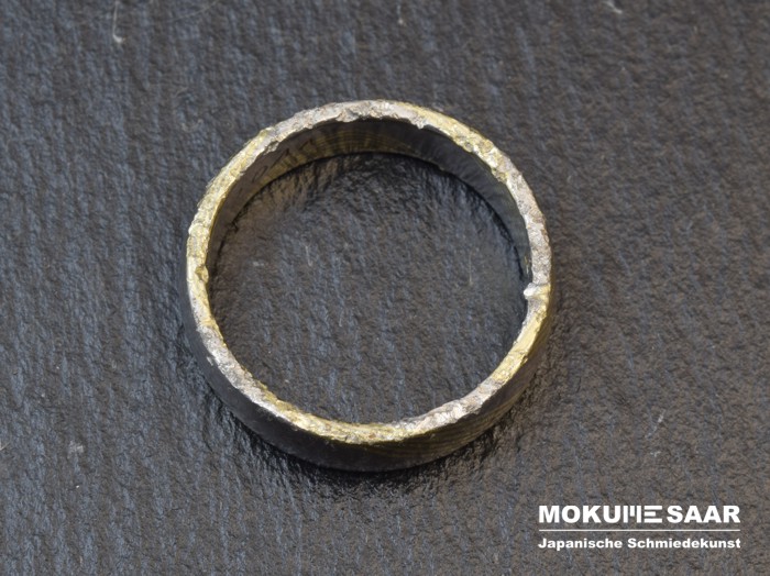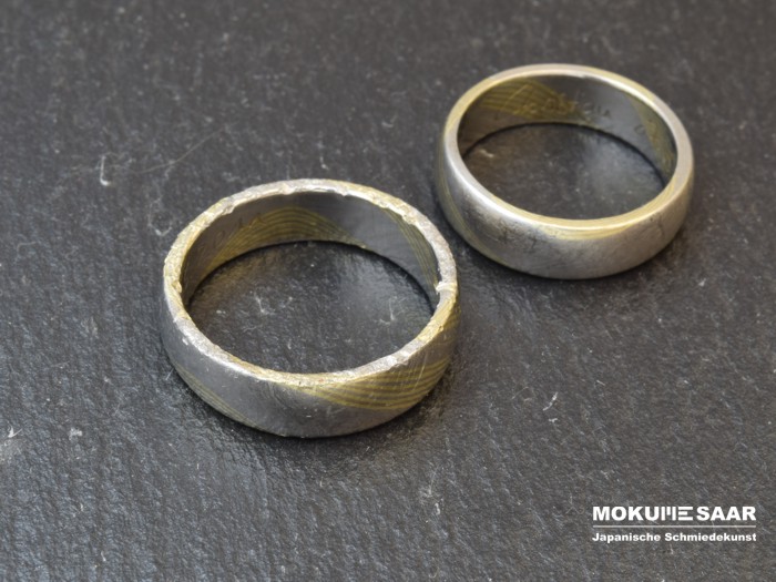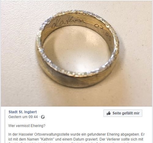 Die schönsten Geschichten schreibt das Leben."Markus Eckardt. Könnte das einer aus deiner Werkstatt sein?" Anfang Mai erhielten wir bei Facebook die Nachricht eines Freundes, der uns auf den Aufruf einer saarländischen Stadt aufmerksam machte. Jemand hatte einen Ehering gefunden und seinen Fund bei dem Fundbüro der Stadt abgegeben. Wegen des markanten Mokume Gane Musters und der ungewöhnlichen Gravur des Ringes dachte unser Freund sofort an unsere Goldschmiede. Und tatsächlich: diesen Trauring erkannten wir auf Anhieb. Die Hochzeit war zwar einige Jahre her, aber wir erinnerten uns noch gut daran. Und in fünf Tagen war auch noch der Hochzeitstag. Was für ein Zufall! Umgehend setzten wir uns mit den Eheleuten in Verbindung. Es stellte sich heraus, dass der Ehemann den Ring mehrere Wochen zuvor bei einer Fahrradtour verloren hatte. Seinen Ring wieder zu bekommen, daran hatte er nicht mehr geglaubt. Die Familie war überglücklich über den Fund. Allerdings war die Wiedersehensfreude ein bisschen getrübt, denn offensichtlich war ein Rasenmäher darüber gefahren und hatte das wertvolle Stück dadurch zum Vorschein gebracht. Oh je, die Kanten des Ringes waren wirklich sehr ramponiert. "Könnt Ihr das denn wieder reparieren?" Den besorgten Ehemann konnten wir schnell beruhigen. Wir versprachen, den Ring schnell und kostenlos (das war uns eine Ehre!) wieder in seinen ursprünglichen Zustand zurück zu versetzen. Eine Herausforderung, die wir mit Vergnügen angenommen haben. ![]() Wie Ihr sehen könnt, ist die Restaurierung sehr gut gelungen. (Bei der Gelegenheit haben wir auch gleich den Trauring der Ehefrau wieder aufgearbeitet - ein Service, den wir gern für unsere Kunden und ihre Anfertigungen ausführen.) Schließlich war es der Familie nicht möglich, ihre Ringe am Hochzeitstag abzuholen. Aber nur kurze Zeit später nahmen sie ihre Ringe hocherfreut und wie neu wieder in Empfang. Eine schöne Geschichte - hier war Social Media doch wirklich für etwas Positives gut.