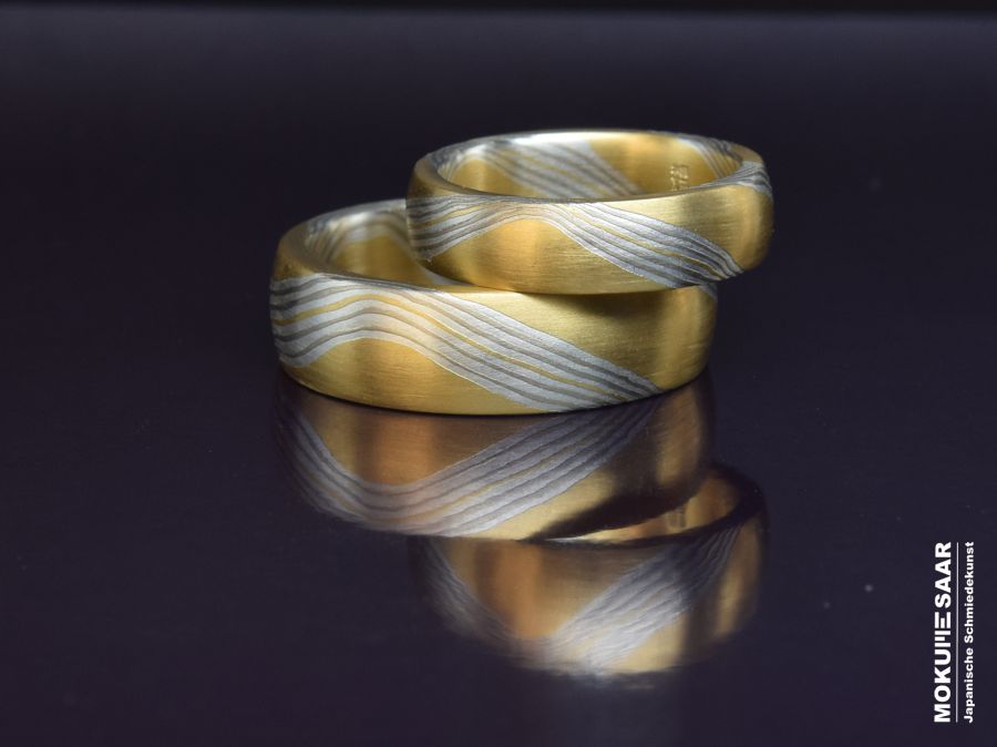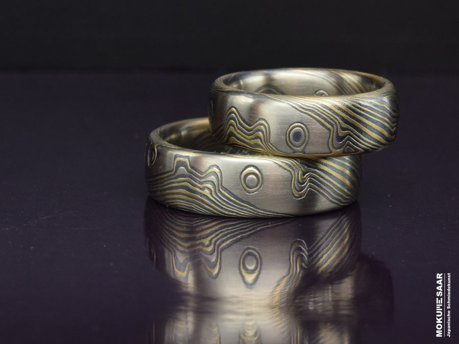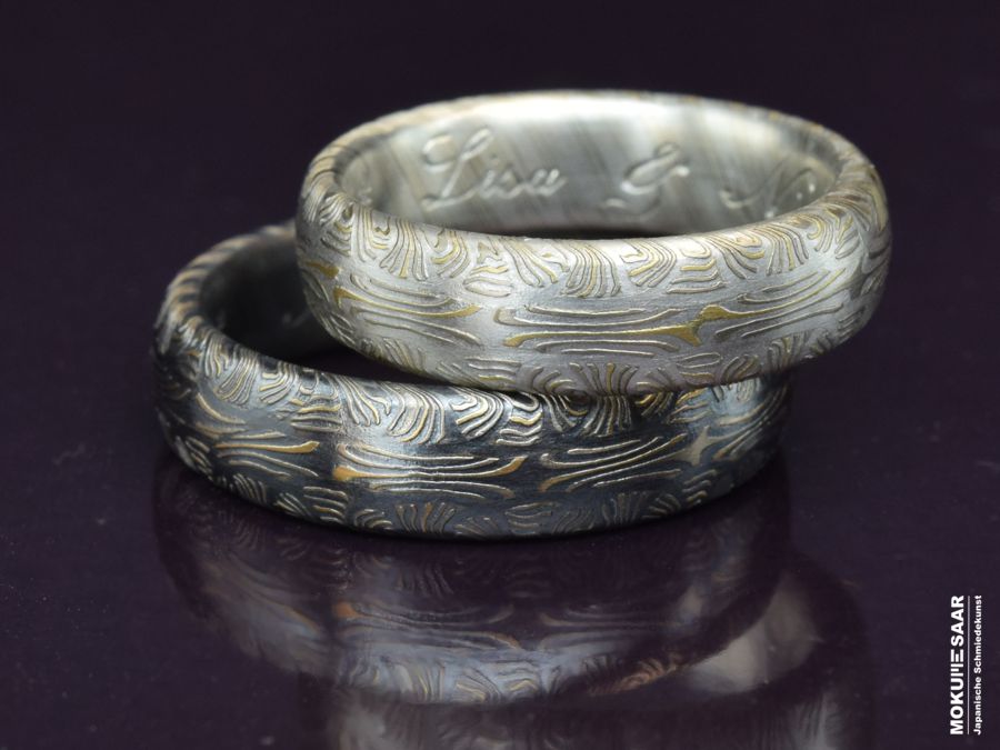Bist du auf der Suche nach etwas wirklich Besonderem für deine Trauringe? Hier bei Mokume-Saar bieten wir handgefertigte Mokume Gane Ringe, die nicht nur einzigartig, sondern auch individuell sind. Mokume Gane ist eine traditionelle japanische Schmiedetechnik, die eine lange Geschichte hat. Ein Ring aus Mokume Gane ist also nicht nur ein Schmuckstück, sondern auch ein Stück Kulturgeschichte. Was unsere Ringe wirklich besonders macht, sind die ungewöhnlichen Muster, die wir mit dieser traditionellen japanischen Schmiedetechnik erschaffen. Jeder Ring wird von uns mit großer Sorgfalt und Liebe zum Detail handgefertigt. Den Schmiedeblock als Ausgangsmaterial für unsere Schmuckstücke stellen wir von Grund auf selbst her. Wir verwenden recyceltes Grundmaterial und stellen damit sicher, dass jedes Stück nicht nur einzigartig, sondern auch umweltfreundlich ist. Die Muster unserer Trauringe sind unvergleichlich. Durch die Kombination verschiedener Edelmetalle entstehen einzigartige Maserungen von warmen Goldtönen bis hin zu Graunuancen. Neben ihrer einzigartigen Ästhetik bieten unsere Mokume Gane Ringe auch einen hohen Tragekomfort. Feine Handwerkskunst und hochwertige Materialien sorgen dafür, dass eure Ringe nicht nur schön sind, sondern auch angenehm zu tragen. Aber das ist noch nicht alles. Wir gravieren eure Trauringe persönlich in alter Handwerkskunst mit einer Handgravur. So erhalten eure Ringe eine ganz persönliche Note, die eure Liebe und Verbundenheit für immer in euren Eheringen festhält. Bei Mokume-Saar legen wir großen Wert auf gute Beratung und persönlichen Service. Wir haben ein offenes Ohr für eure Wünsche und Ideen und setzen sie mit Liebe zum Detail in ein einzigartiges Design um. Es ist uns sehr wichtig, dass eure Trauringe genau euren Vorstellungen entsprechen. Das Ergebnis? Ein echtes Unikat, das eure Liebe und eure Persönlichkeit perfekt zum Ausdruck bringt.